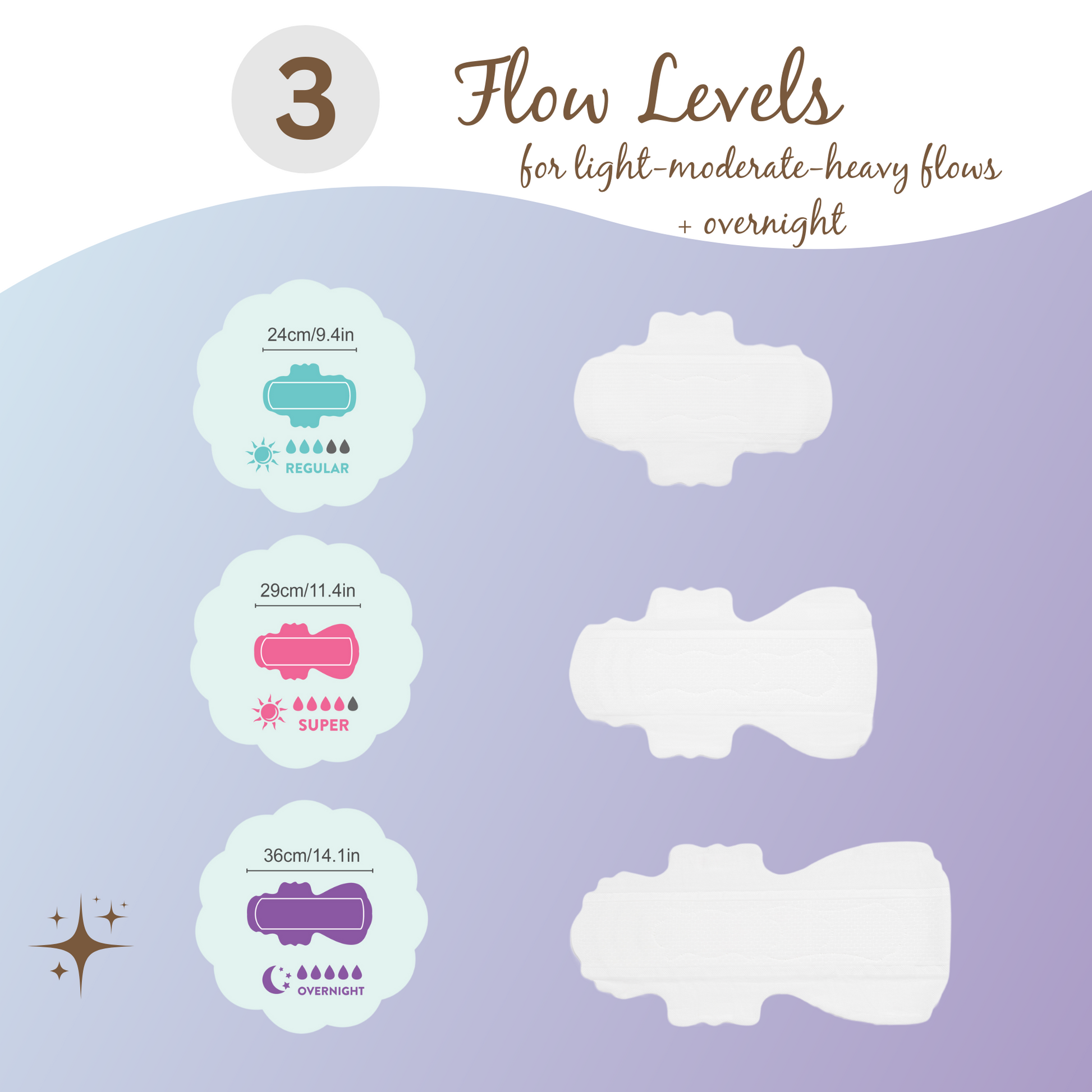 ✅ 24cm / 9.4in – Regular: Ideal for light to medium flow, perfect for everyday comfort.