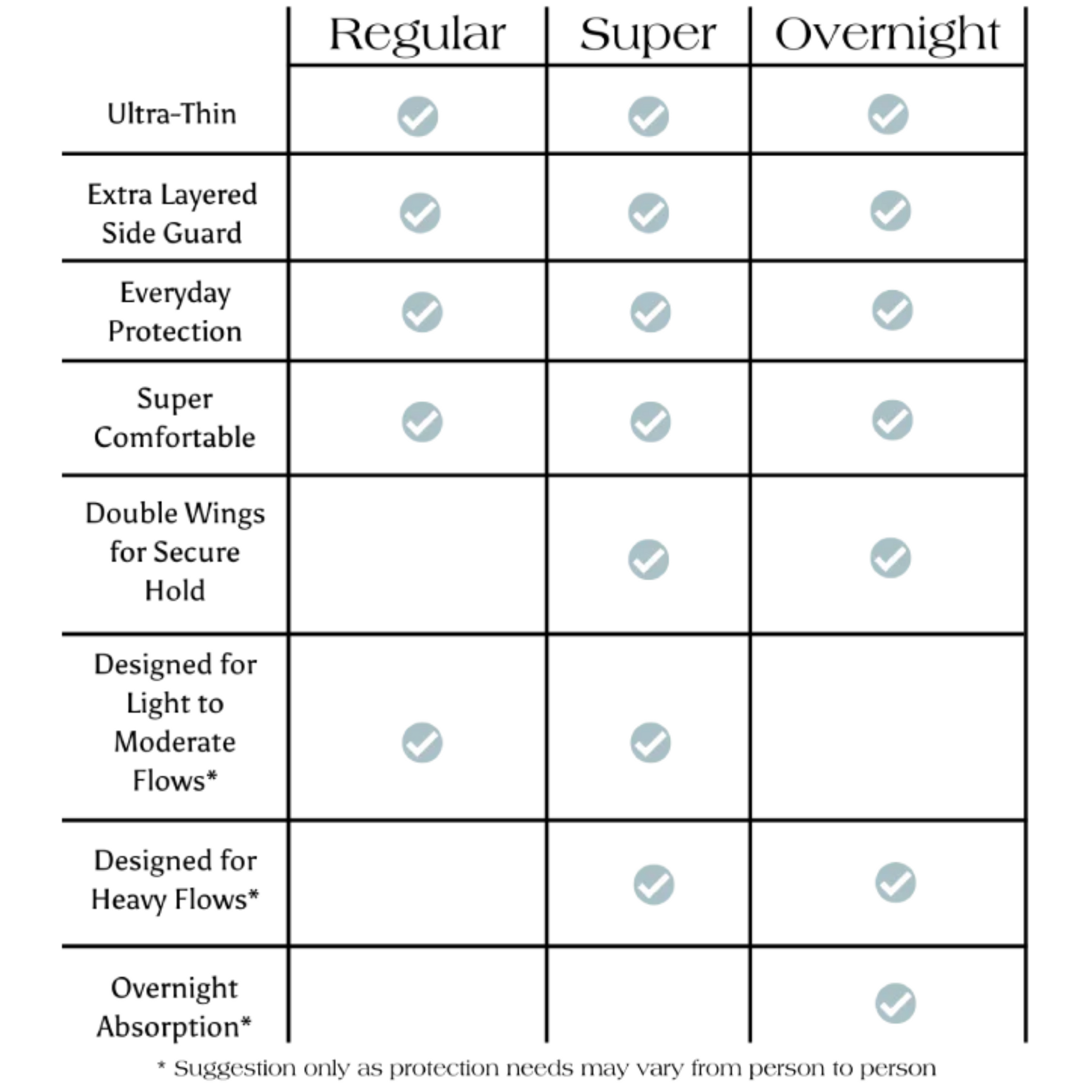 Our pads are designed in different sizes to give you comfort and protection all day and night.